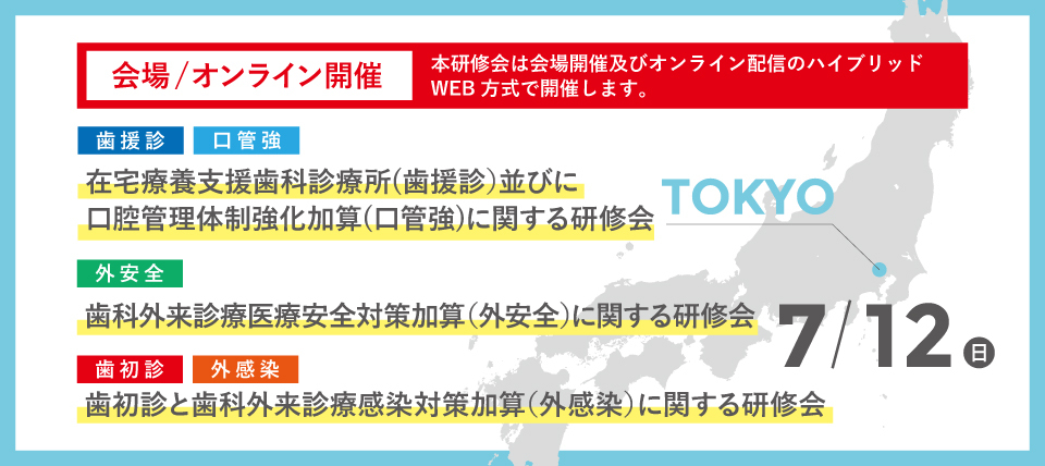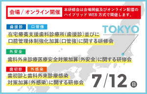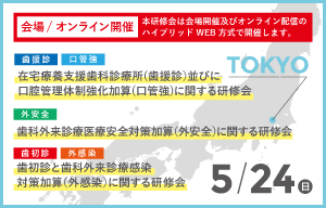 今後の在宅療養支援歯科診療所(歯援診)並びに口腔管理体制強化加算(口管強)に関する研修会、及び歯科外来診療医療安全対策加算(外安全)に関する研修会、歯初診と歯科外来診療感染対策加算(外感染)に関する研修会は、以下を予定しております。